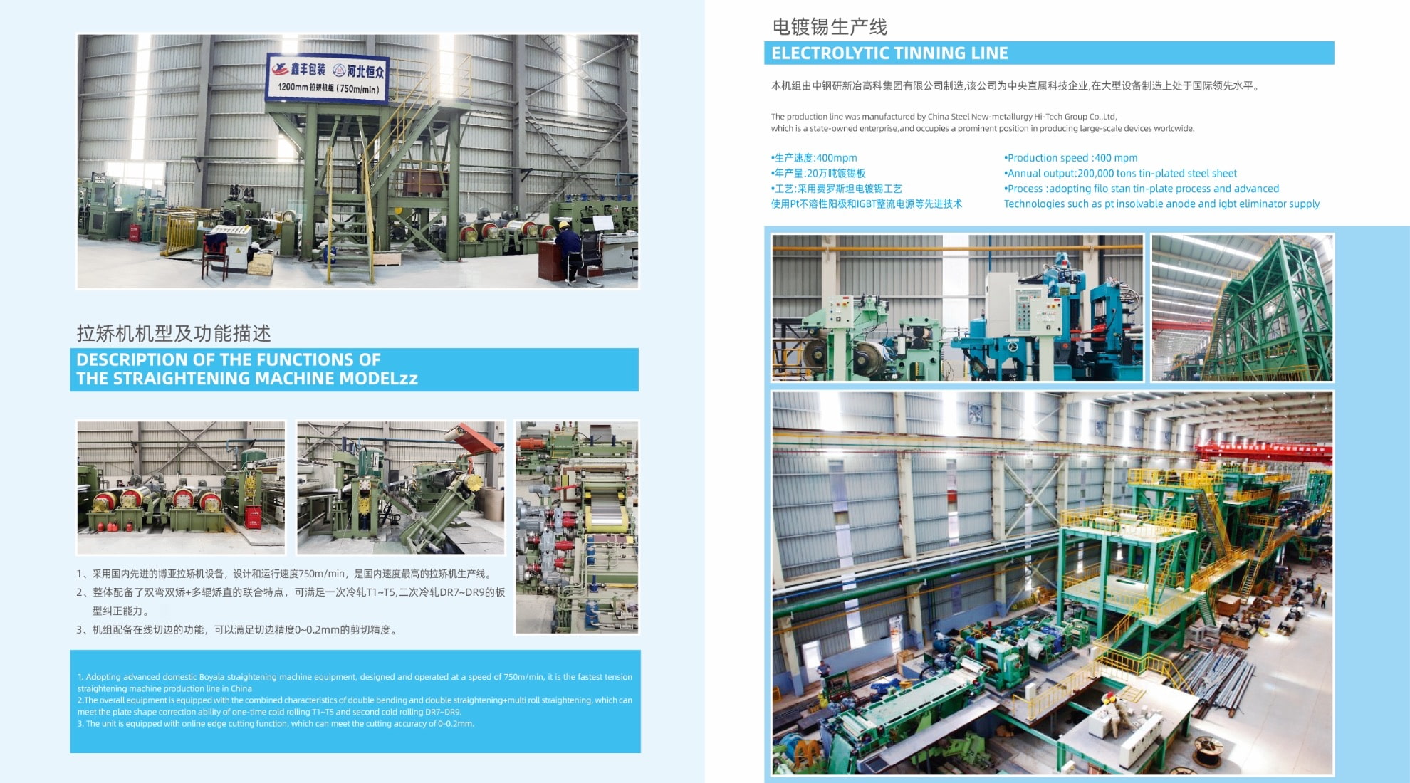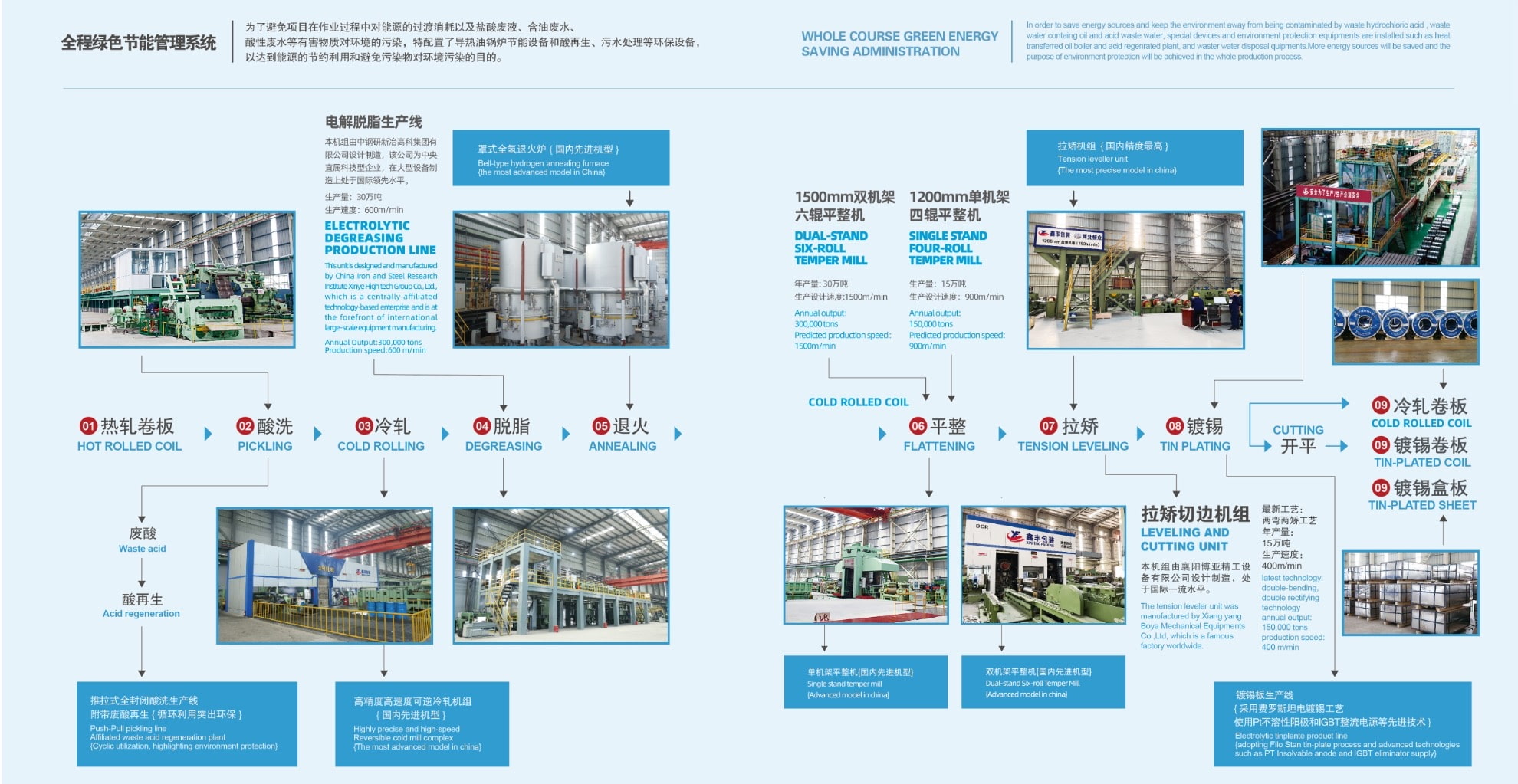 热轧板卷经酸洗、冷轧、脱脂、退火、平整、拉剪处理后进行电镀锡,酸洗、冷轧、罩式退火、电镀锡等生产设备均由国内设计院和装备制造企业设计和制造,推拉式酸洗生产线(年产能50万吨)附带废酸再生设施,电镀锡生产线(年产能20万吨)采用弗洛斯坦电镀锡工艺并使用PT不溶性阳极和IGBT整流电源等先进技术,处于国内较领先水平。